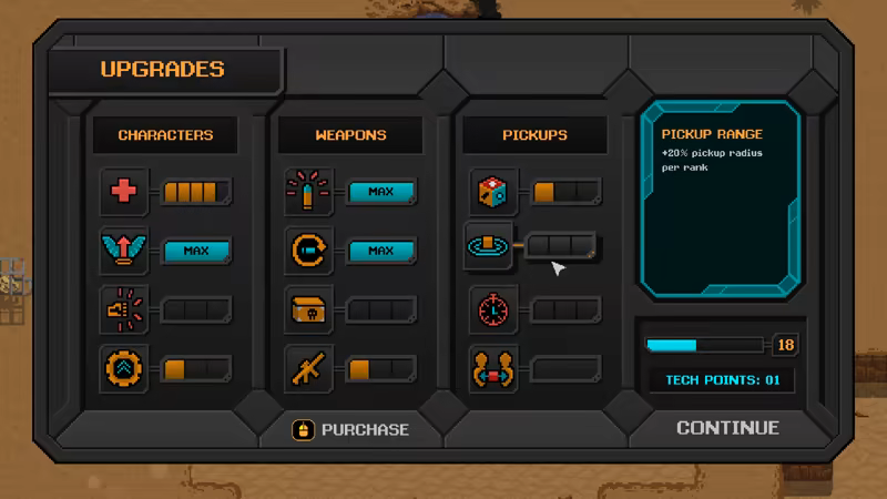 Every run you’ll gain “Tech” points which can be used to purchases upgrades
