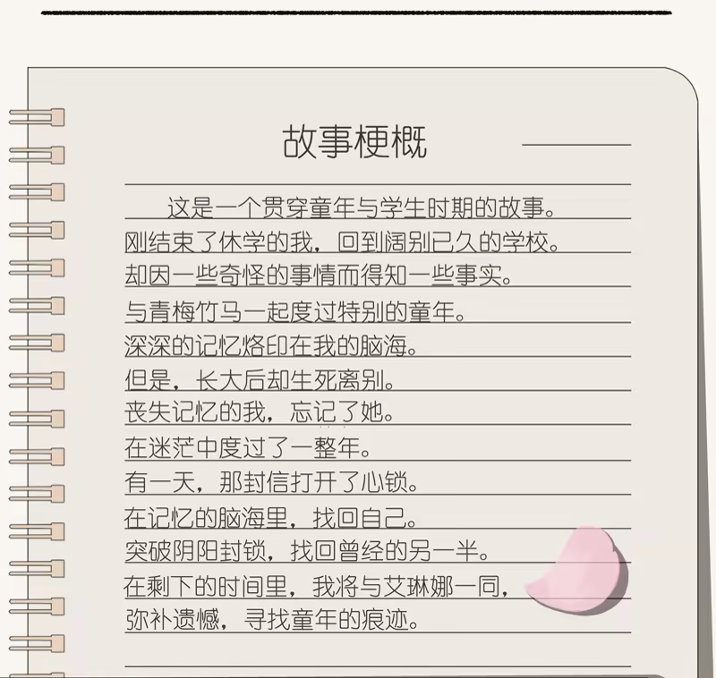 游戏介绍 这是一个贯穿童年与学生时期的故事。 刚结束了休学的我,回到阔别已久的学校。 却因一些奇怪的事情而得知一些事实。 与青梅竹马一起度过特别的童年。 深深的记忆烙印在我的脑海。 但是,长大后却生死离别。 丧失记忆的我,忘记了她。 在迷茫中度过了一整年。 有一天,那封信打开了心锁。 在记忆的脑海里,找回自己。 突破阴阳封锁,找回曾经的另一半。 在剩下的时间里,我将与艾琳娜一同,弥补遗憾,寻找童年的痕迹。