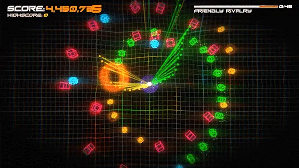 In classic arcade style, score is king. Color-matched shots earn the greatest points and one-hit kills. Mismatched shots require multiple hits and score less. Take out enemies at greater distance to earn more bonus points for the kill. Your shield can save you once, but enemies it kills when destroyed won’t count to your score.