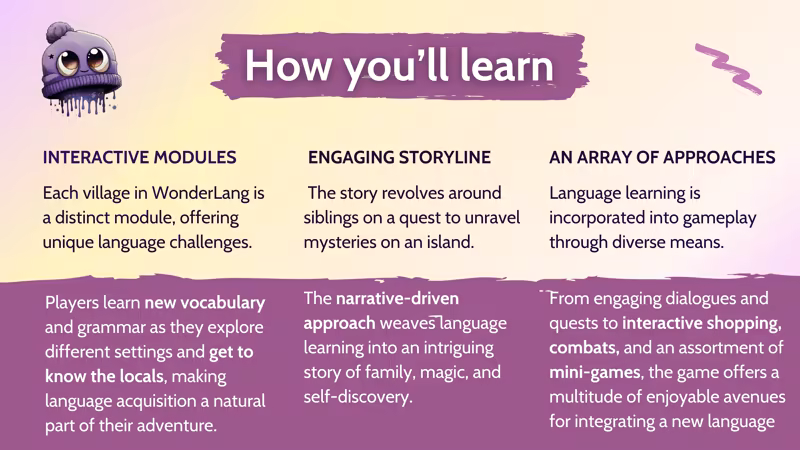 WonderLang是设计用于 初学者、A1级和A2级,允许您在不事先知道语言的情况下潜入游戏. 虽然游戏目的并非完全取代传统语言课程,但提供一种 沉浸和愉快的练习方式 一种新的语言 逐渐。