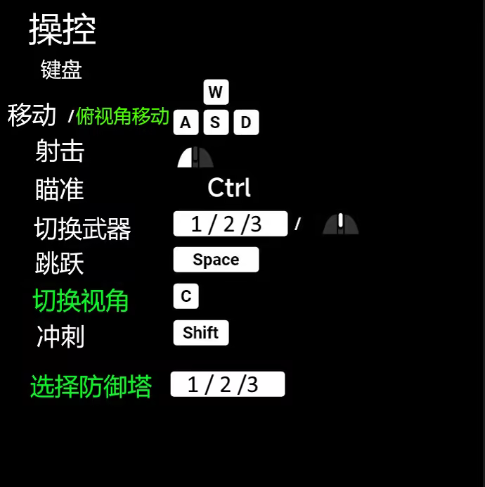小键盘1、2、3可以快捷选择防御塔,W A S D可以进行移动,人物视角和俯视角,两个视角都可以移动