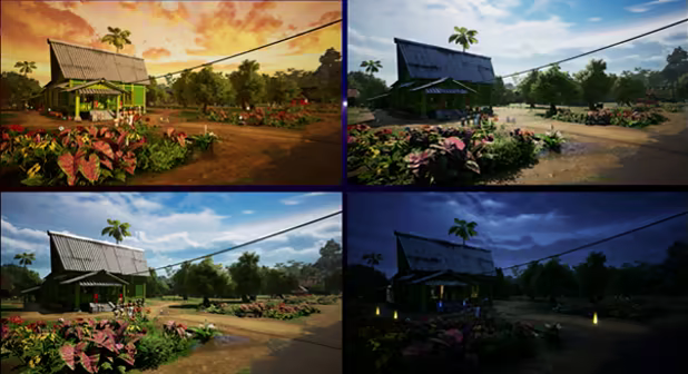 A full day-night cycle and dynamic weather system