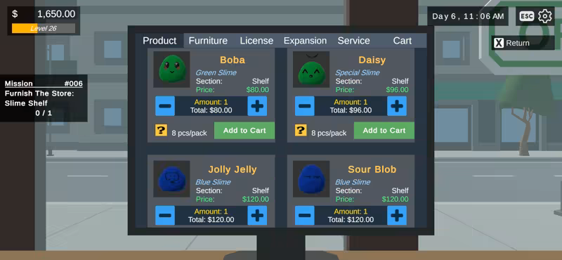 Slime Store模拟器是一个小型的休闲游戏,在那里你经营一个销售可爱的粘液的商店! 订购各种不同种类的粘液,自行定价,收钱,聘请帮手,扩大店面.