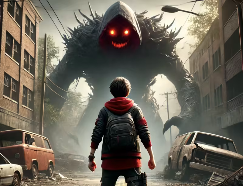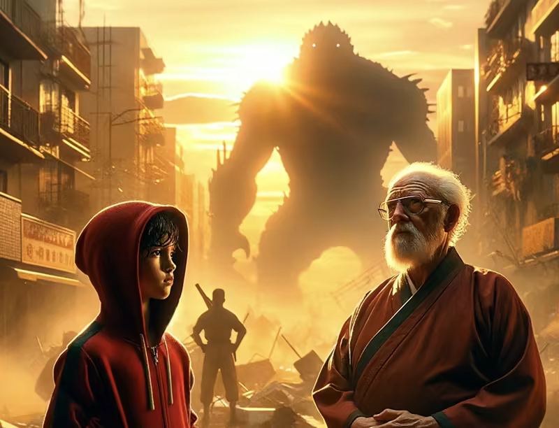 Stepping outside, he witnesses a massive monster wreaking havoc on the city.