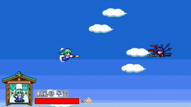 "SANAE's Sylphid Breeze" is a Touhou fan game with cute pixelart. With “SPELL SPOILER" she has created new ability, she inhales enemies and imitates their ability.