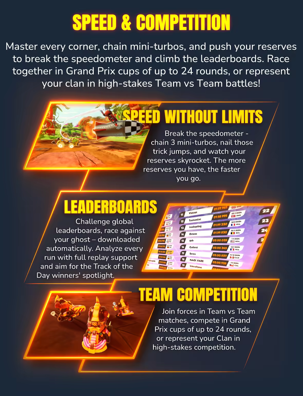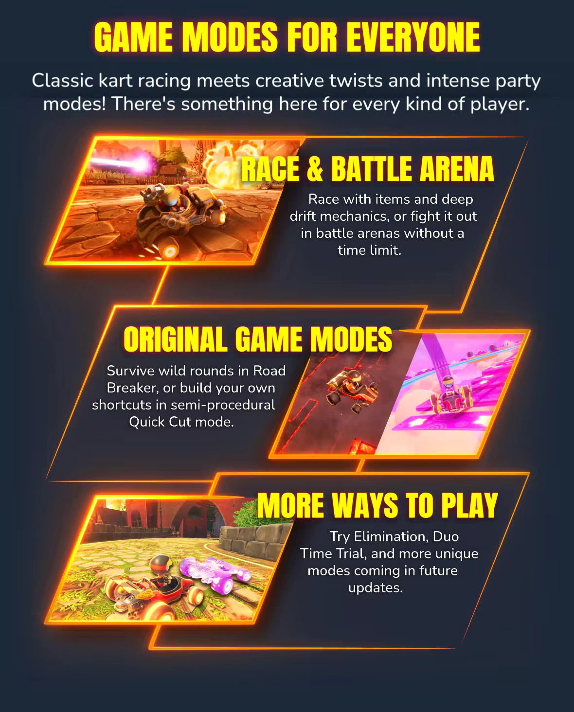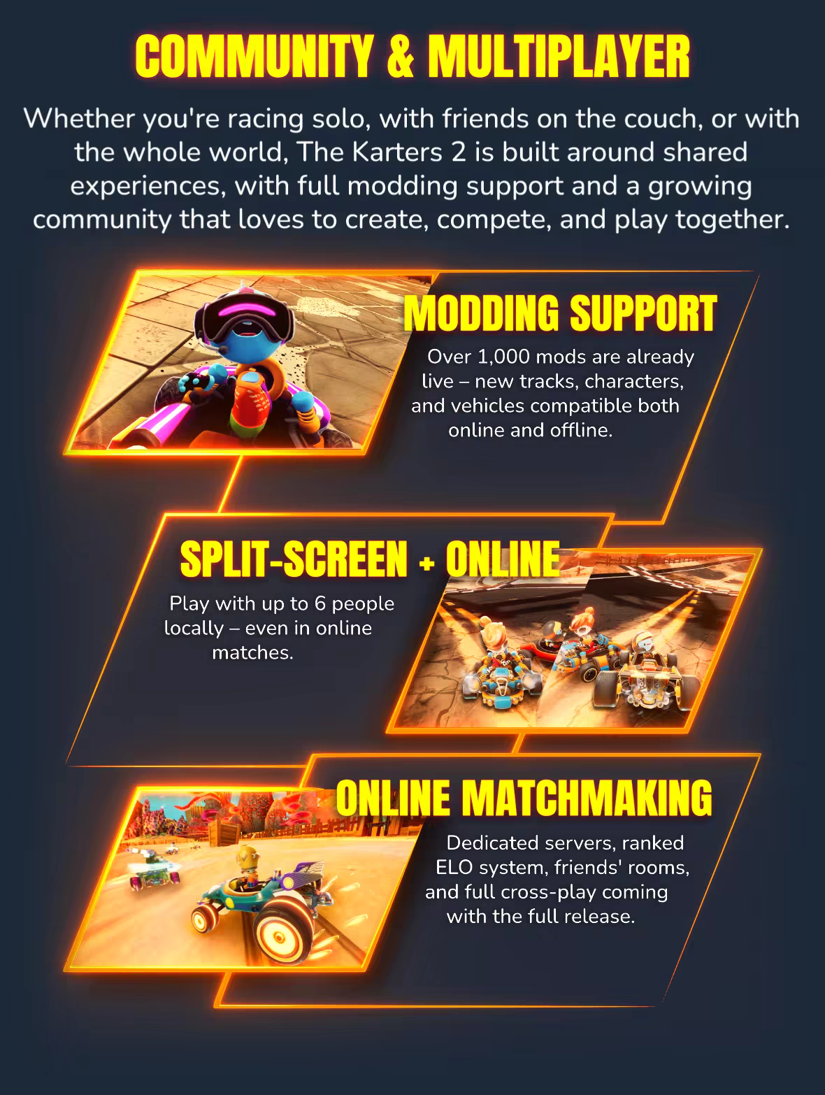 Get ready for The Karters 2: Turbo Charged, a fast-paced, action-packed racer built for casual chaos and competitive mastery. With intense multiplayer, deep mechanics, and full modding support available from day one, it’s a karting experience with no speed limit and no limits on creativity.