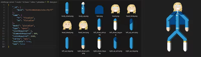 创建新的火柴人皮肤很容易,拿起你最喜欢的绘图软件(GIMP、Photoshop、Krita 等),绘制身体部位,并为你的皮肤决定名称、稀有度和价格。