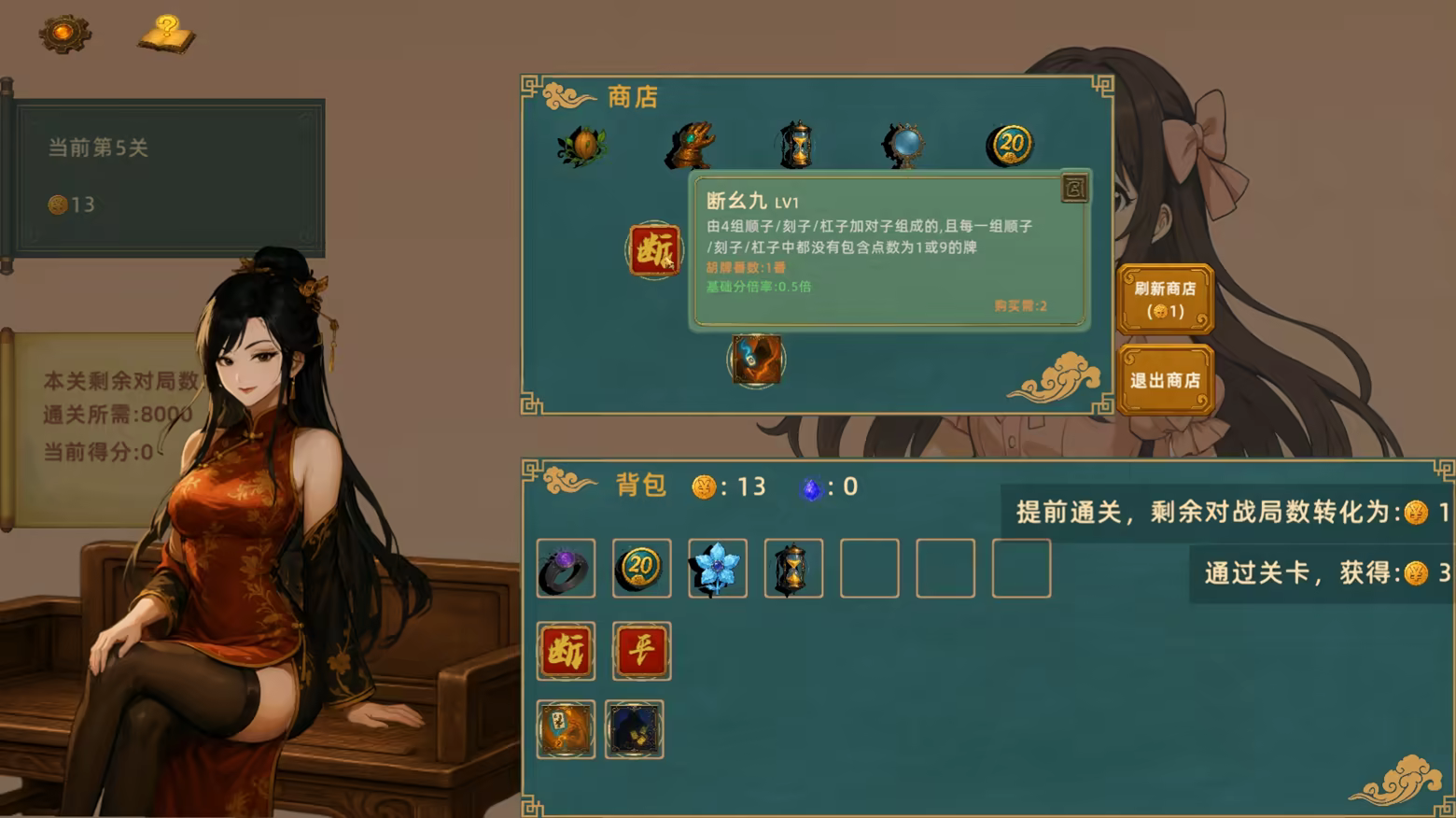 通过战斗获得金币,在商店中购买灵牌具、升级技能或获取新牌型。每一次购物,都是一步步走向胜利的关键决策。