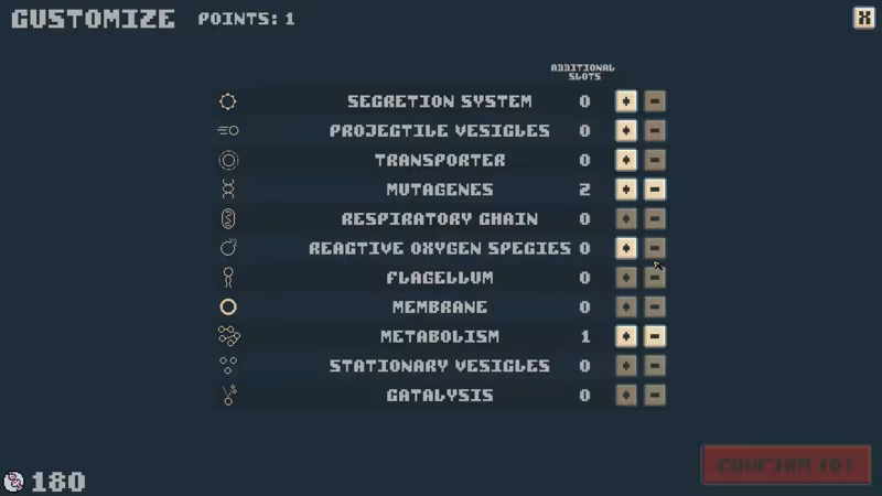 以单细胞生物开始. 分裂你的细胞 生长和增强你的生物 成为一个适合生存在敌对环境中的生物 每个细胞都有自己的一组突变,所以你不仅可以选择哪一个升级来选择,而且可以把它们放在哪个地方来在它们之间拥有最好的协同.