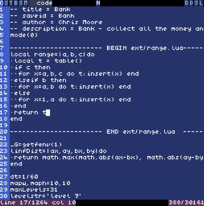 There is a built-in editor, but it is not an editor for only this game – instead it is an editor for the fantasy-console designed to run this game. From this you can fully edit any aspect of the game –levels, sprites, sounds, code, etc.