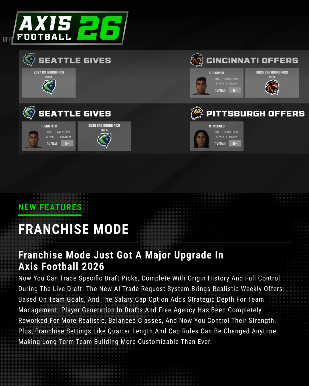 Axis足球2026是一个完整的美式足球模拟,具有流畅的游戏玩法,无尽的定制和业界最佳的特许经营模式。新的轴心足球2026即时重播!完整的播放编辑器大规模改进的照明和图形最逼真的视觉效果呢!用户操作按钮,用于增加参与度和玩家奖励新的阻止和释放路线成千上万的照片般逼真的玩家和教练肖像完全重新创建的公告系统重新设计的人群系统,具有动态人口和团队着色,大大改善了音频,具有新的人群欢呼声,音量缩放,城市特定的圣口号等等。数百条新航线,数十个编队,成千上万的玩家使用新的进攻性滑块来控制您的团队在特许经营模式下的第4次交易报价的频率彻底修改了选秀权交易系统,以完全控制您的选秀权新的特许经营设置菜单,以对特许经营模式进行更多的自定义特许经营工资帽选项草案和自由球员球员池强度控制新的开球转换选项明星球员指标,以突出显示影响球员在球场上大修AI play调用扩展深度图位置精炼的球员移动大规模优化最流畅的游戏玩法,但完整的特许经营模式功能: 多个联赛设置选项 (NFL风格,等级风格) 历史记录跟踪球员合同交易伤害练习小队自由球员退役球员每周和每年奖励动态,分层的联赛结构,包括季后赛,晋升和降级,根据表现,年龄,潜力,和游戏时间赛季结束选秀赛季长球队统计个人联赛领袖统计特许经营统计深度图表控制比赛,教练,观看或模拟比赛联赛和球队时间表查看器观看其他比赛自定义: 完整的团队创建者/编辑器套件。自定义团队名称,颜色,制服,字段,播放选择,标志,和更多!Playbook编辑器游戏模式: 玩家Vs AI教练模式 (1p和2p) 观众模式本地玩家Vs玩家特许经营模式