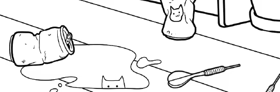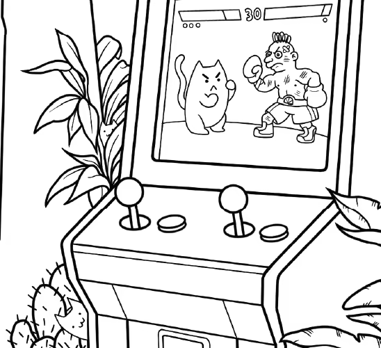 这是一个简短的隐藏对象游戏. 50只猫藏在这张手画里 里面有植物 街机柜 甚至还有一只可爱的可乐