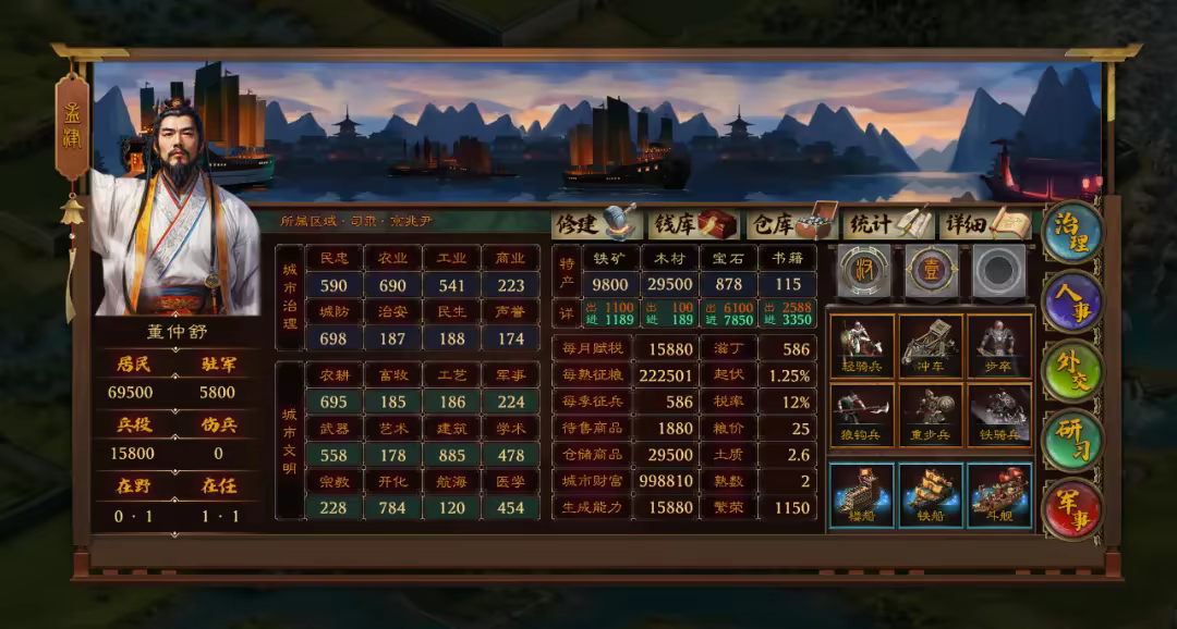 ➐ 完善的数据统计,每年的经济规模、人口、农业、官员政绩、将帅战绩都有完善统计。