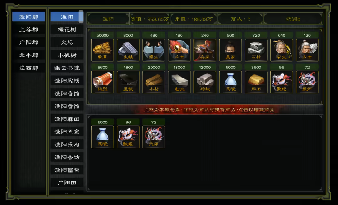 我们把全部生产设定为“官营”方式,就是官家负责所有生产工人的工资,所产产品全归官家自由使用或出售。所以跑商、组建军队、送礼及生产环境调用材料,都无需支付费用。跑商是获得收入的重要途径,由于现在所有商品属于官家,所以商队的意义在于运输产品到其他地方的市场。但由于商品种类繁多,有些需要,有些可售,所以新增了商品待售区。在待售区里面的商品,商队和军师都可以随意变卖。