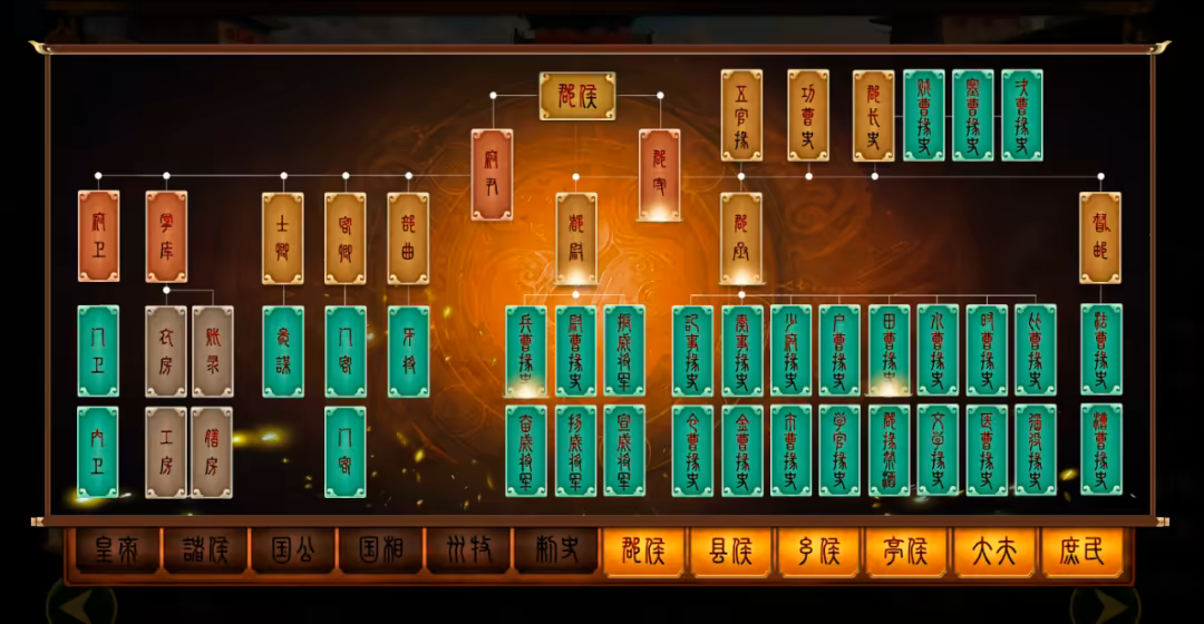 封官可称为“成体系”了。首先是分文官、武职和爵位,每个人物都可以同时拥有三类各一。郡侯可以封郡侯及以下的官职,官职有上下级体系,必须上级有人,下级才能封。官位对行政的方方面面都有影响,可以大大方便内政操作和促进施政效果。另外就是体系,如每个势力等级都拥有相应的官职图,如孙坚的【郡侯】: