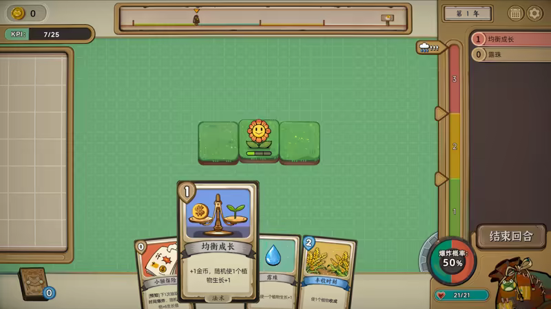 《种呱得呱》是一款肉鸽卡牌游戏。你将扮演农场管理者,完成青蛙公司下达的KPI指标。你将通过紧张刺激的抽卡,规避或利用时间爆炸,获得卡包和宝箱,构建你的卡组,打出卡牌获得金币收益。你还需要有策略性地选择前进的路线,游戏中你会遇到丰富的抉择事件、灾年和大天灾挑战。