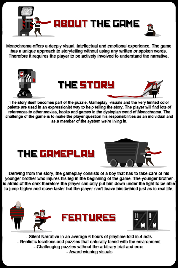《单色调》是一款质疑电子游戏意义的游戏。这款游戏可能会让玩家获得娱乐体验同时也能帮助他们进行社会交往。一款好游戏应该可以从情绪和智力上满足玩家的需求,让玩家们思考自己的人生,社会和国家系统,就像一部好电影给人带来的启示一样。 本作画风非常独特,用灰色和红色展现了一个世界,一对兄弟必须在这里解开各种谜题并闯关前进。 《单色调》点评6.8分 无色的兄弟之情 《单色调》大胆的使用了黑白画面构建了游戏的背景世界,可惜游戏性方面有些平庸。 2014-06-03 《单色调》剧情一览 生死逃亡6小时 Nowhere工作室放出了他们制作的解密游戏《单色调》的游戏视频和16张游戏截图。这款游戏设定在一个1950年的平行宇宙中,讲述了一个男孩和目睹邪恶集团犯罪的弟弟的故事 2014-05-29 兄弟情深《单色调》免安装中文版下载发布 下载地址:点击进入 【游戏封面】 游戏名称:单色调 英文名称:Monochroma 游戏类型:动作冒险(ACT)类 游戏制作:Nowhere Studios 游戏发行:Nowhere Studios 2014-05-29 风格迥异 另类解谜新作《单色调》登陆Steam 早前我们曾报道过反乌托邦解谜游戏《单色调》,这是一款由Nowhere工作室打造的风格奇异的独立游戏,近日工作室公布了一段游戏演示视频和一些新截图,一起来看看吧。 2014-05-27 《单色调》首发预告 风格奇诡的黑白世界 来自土耳其的独立开发团队Nowhere Studios公布了他们即将到来的电影化平台解谜游戏新作《单色调(Monochroma)》的预告片,效果非常引人注目。 游戏预告片: 故 2014-05-02 《单色调》主线流程视频攻略 第一章-郊区(1) 原帖:点击进入 第一章-郊区(1) 第一章-郊区(2) 第一章-郊区(2) 第二章-贫民区(1) 第二章-贫民区(1) 第二章-贫民区(2) 第二章 2014-06-04 标签:单色调|流程攻略|攻略 游民速攻组《单色调》流程图文攻略 第一章-郊区(1) 原帖:点击进入 基本操作 上下左右:↑↓←→ 跳跃:↑键 Ctrl:移动箱子、控制开关 个人感想: 这游戏比较特别,自带BGM的无声电 2014-05-31 标签:单色调|流程攻略|攻略