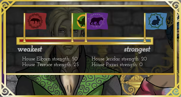 Serafina's Crown is a fantastical, dramatic visual novel with branching storylines, a stat-based strategy game, and dating-sim elements. In the game -- which takes place in the same world as Woodsy Studio's first release, Serafina's Saga -- you play as Odell Perin, an inexperienced young woman who must navigate political intrigue, romantic confusion, and an ongoing murder mystery while serving as Regent of Darzia. The branching storylines depend on your decisions: forming romantic relationships with other characters, finding Queen Belatrix's killer, and determining the next monarch. The game also features a dynamic debate system that allows Odell to argue certain points in court based on her accumulated stats.
