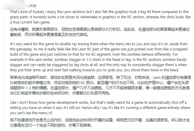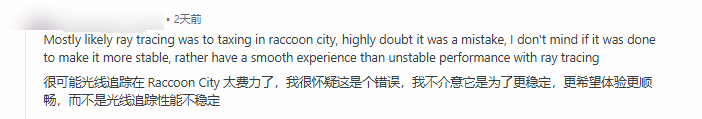 玩家们对这次补丁调整的看法也呈现出明显的两极分化。不少玩家与数毛社观点一致,对画质下滑表示不满,有Reddit用户直言,浣熊市场景的画质与游戏中格蕾丝相关场景相比差距十分明显,堪称“大幅缩水”。但也有部分玩家表示理解,认为关闭光追后画面更显干净整洁,反而提升了实际游玩体验。
