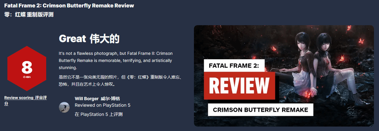 IGN在总评中还做了一个贴切的比喻:电子游戏的重制,就像用相机定格时光里的某一瞬间,开发团队拼尽全力,想要把一件艺术作品从“原本的模样”,复刻成“人们记忆中的样子”。而《零:红蝶 重制版》能做到如今的水准,确实配得上“奇迹(miraculous)”二字。