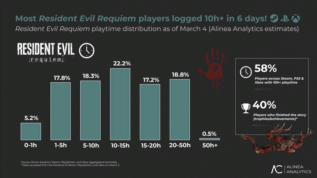 第三方数据分析机构Alinea Analytics的相关数据,进一步佐证了这款游戏的高用户粘性:有36.5%的玩家游戏时长已经超过15小时,深度沉浸在游戏的恐怖冒险剧情之中;另有0.5%的核心玩家游戏时长突破50小时,足以看出他们对这款新作的高度认可和喜爱。