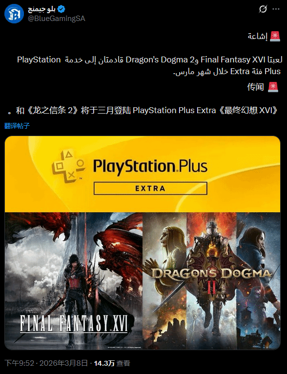 此前有消息流传,《龙之信条2》与《最终幻想16》这两款热门3A大作,有望加入PS PLUS二档会员Extra的游戏目录。这一说法最初由阿拉伯游戏媒体BlueGaming披露后,很快吸引了不少玩家的关注。