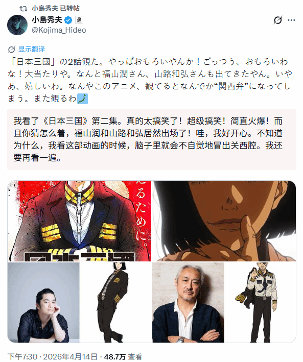 知名游戏制作人小岛秀夫通过个人动态,对近期开播的动漫《日本三国》给予了高度评价,引发不少粉丝和动漫爱好者的关注。
