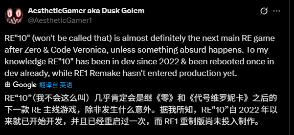 据知名爆料人Dusk Golem透露,该系列下一款主线游戏《生化危机10》早在2022年便已启动开发工作,期间还经历过一次重启。按照计划,这款作品会在《生化危机:零》与《生化危机:代号维罗妮卡》两款重制版推出后再与玩家见面。