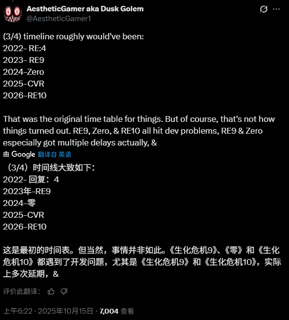 此外他还补充,依据最初的时间表,《生化危机9》本应在2023年发售,《生化危机:零》安排在2024年推出,“代号维罗妮卡”则定于2025年上线,而《生化危机10》的发售时间设定为2026年。不过实际开发过程中,《生化危机9》《生化危机:零》以及《生化危机10》均遭遇了开发问题,其中《生化危机9》与《生化危机10》的情况更为突出,实际上经历了多次延期。