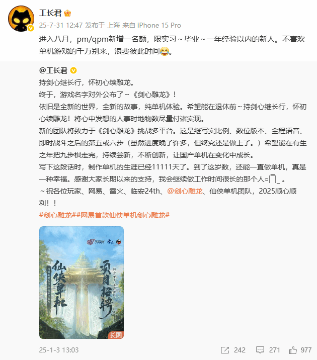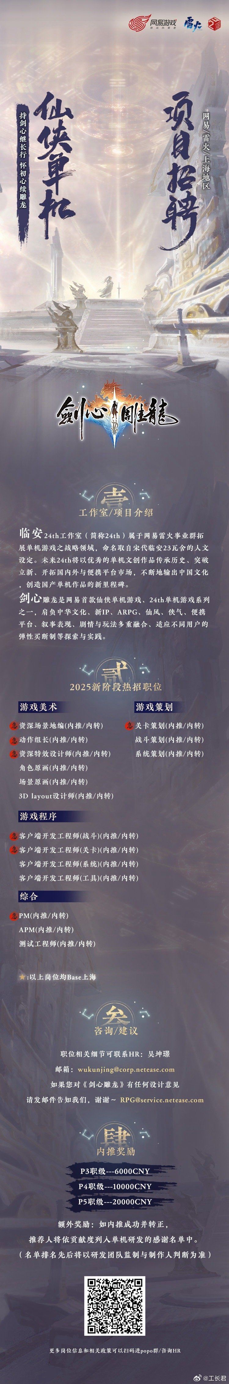 网易旗下首款仙侠题材单机游戏《剑心雕龙》制作人张毅君(工长君)公布 2026 年招聘计划,此次招聘覆盖美术、策划、程序及综合类等多个核心岗位,工作地点定于上海。