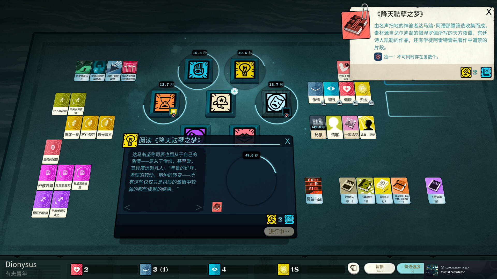 《密教模拟器 (Cultist Simulator)》是一款有关天启与渴慕的游戏,来自《堕落伦敦 (Fallen London)》与《无光之海 (Sunless Sea)》的制作人 Alexis Kennedy。玩家将扮演一名探索邪恶奥秘之人,而背景则设立在一个拥有隐世诸神与多重秘史的世界的1920年代。或许,你是想追求知识、力量、美貌或者复仇,又或许,你不过是想了解隐藏在世界表皮之下的色彩。