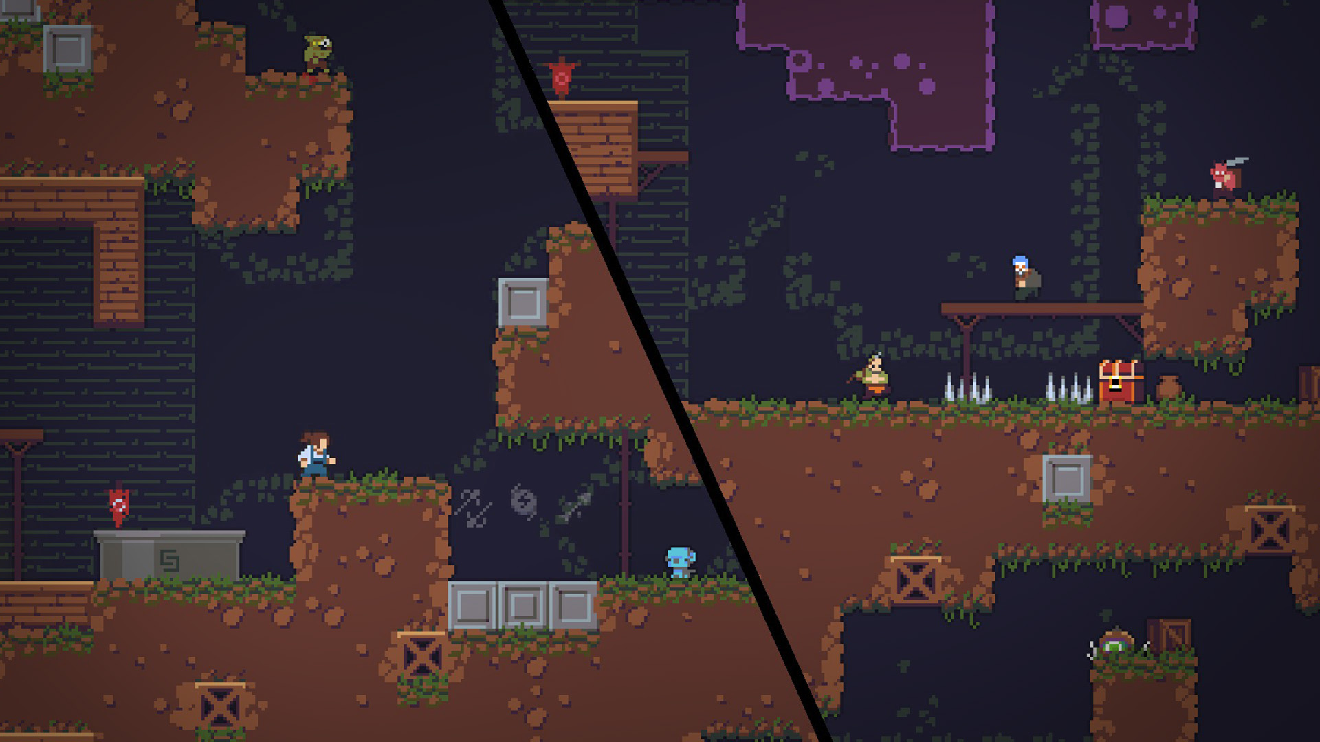 洞窟开拓者是一款现代平台游戏,其中融入了诸如永久死亡、随机药水效果、背包系统、大量物品等常见的Rogue类与RPG游戏的元素。
