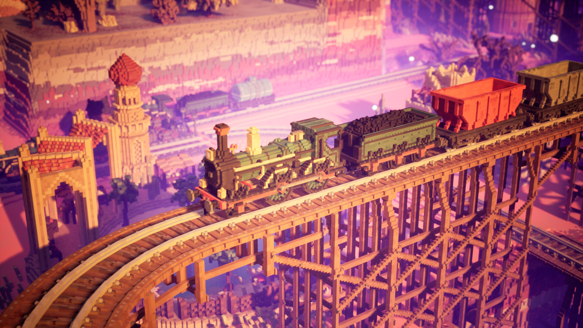 跟随火车的行进方向,在蒸气轰鸣声中穿过由各种生物群落编织而成的多彩环境,