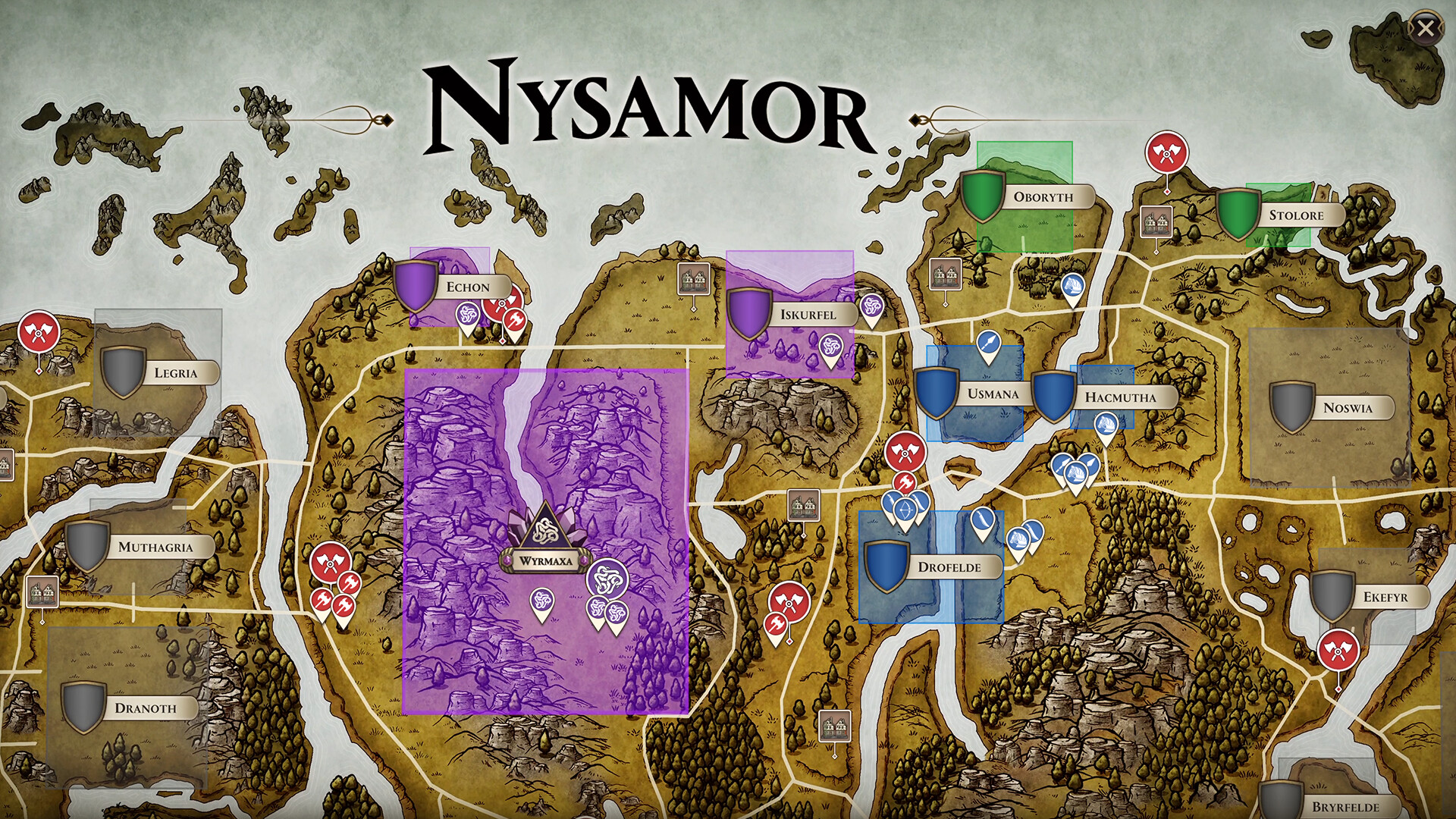 尼萨莫尔是一片神秘而美丽的土地,田野翠绿,地形各异,充满了机遇与危机。在4X模式的世界地图上,与众多AI村庄和王国争夺资源。附近的村庄会根据自己的立场做出回应,或忠于威尔玛克萨的王权,或在你的威吓或怀柔手段下,向你递出橄榄枝。