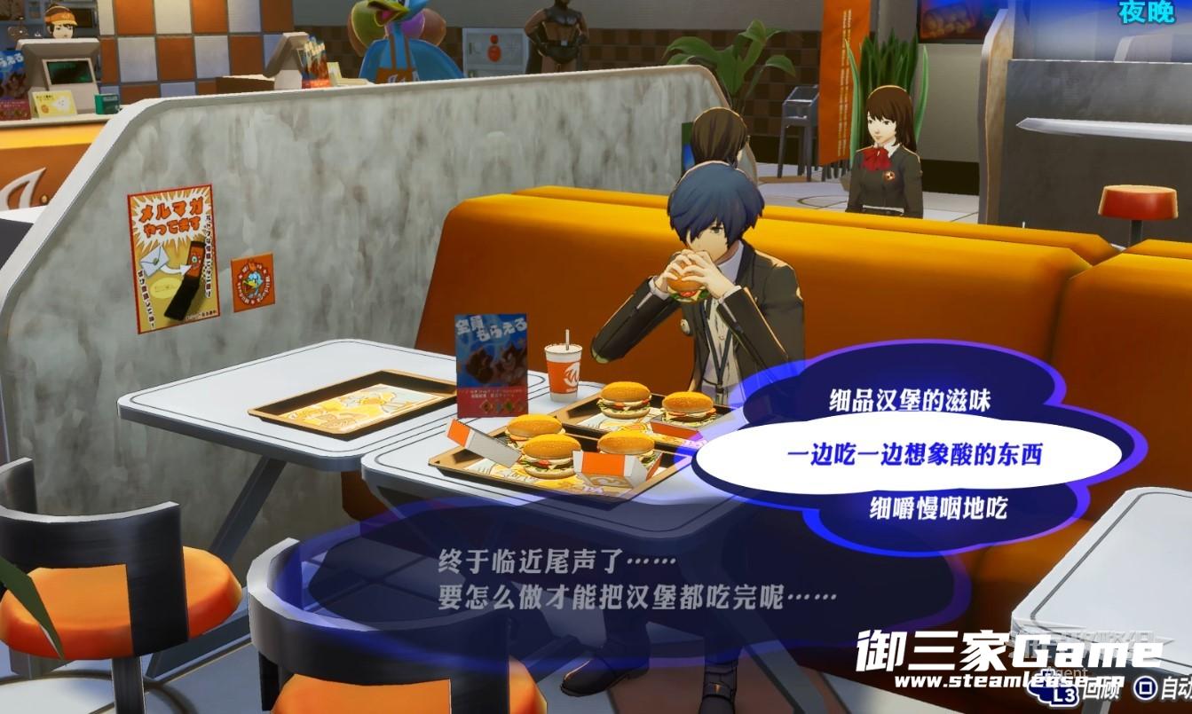 分别选择:不去看汉堡堆成的山并继续吃、毫不停歇地吃下去、一边吃一边想象酸的东西,才能完成挑战,不然会失败。第二天再去找伊丽莎白交任务。
