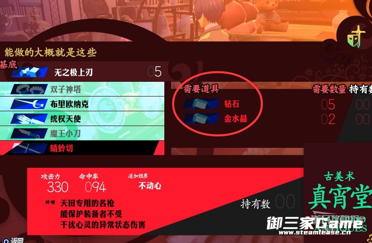 委托91,去古董店合成蜻蛉切,需要钻石、金水晶,等下爬塔就能刷到。
