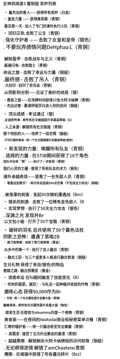 《女神异闻录3Reload(P3RE)》共有49个奖杯,其中包含38个铜杯,7个银杯,3个金杯和1个白金奖杯。下面为大家带来《女神异闻录3Reload(P3RE)》中文奖杯列表一览,一起来看看吧。