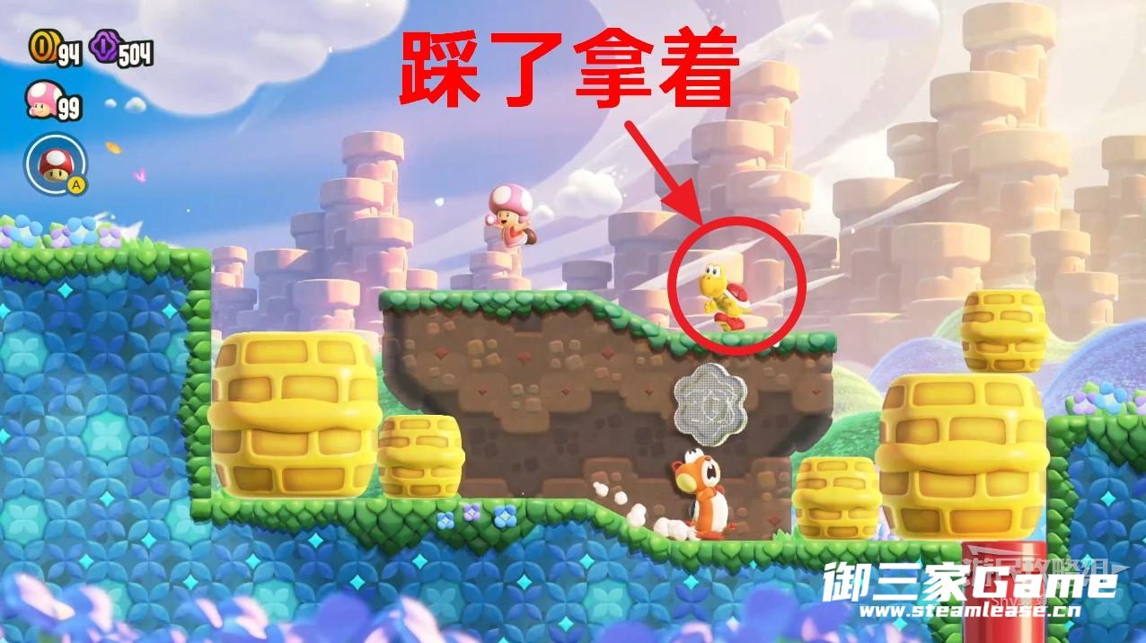 在本关前进的路上,不要拾取大象形态,遇到红色乌龟后,将其踩入壳中,用手拿住。