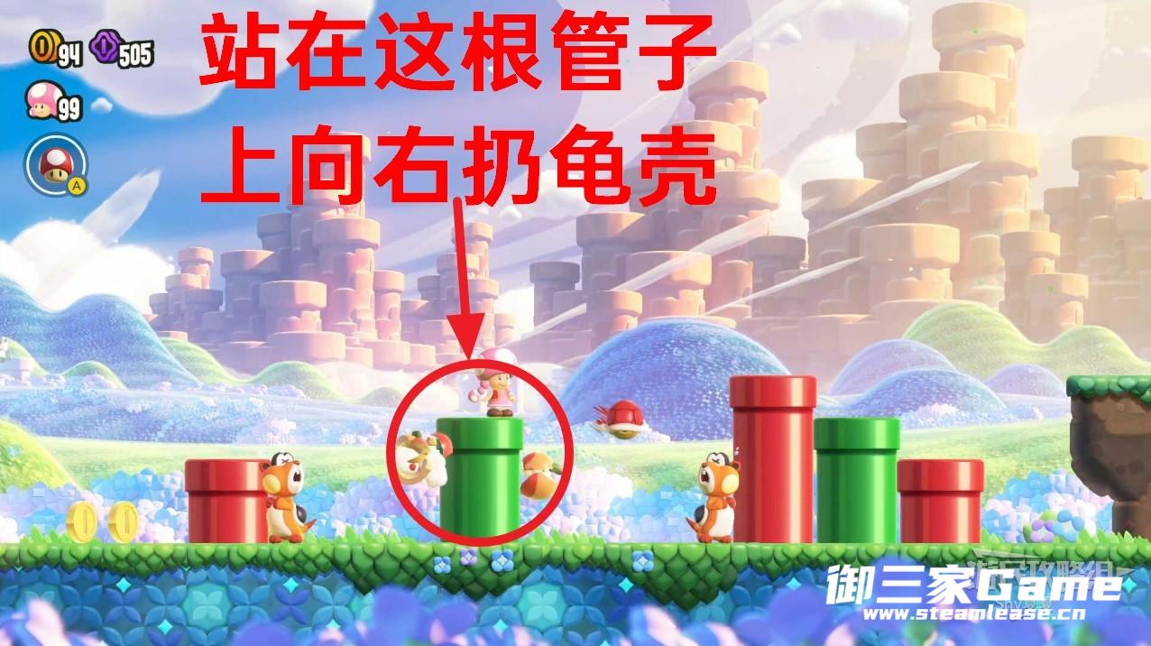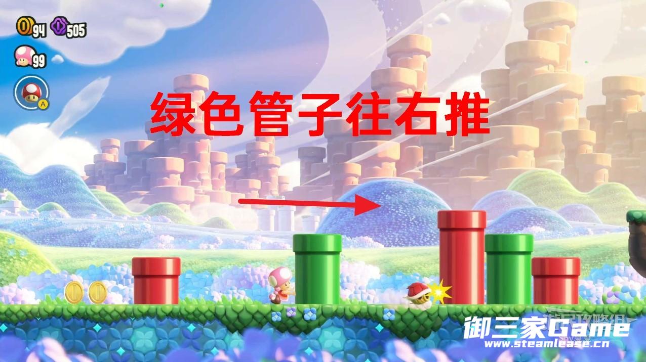 拿着龟壳向右走,会看到两个奔跑的敌人,跳过红色管子,来到绿色管子上,扔出龟壳打死奔跑的敌人后,龟壳会左右移动。