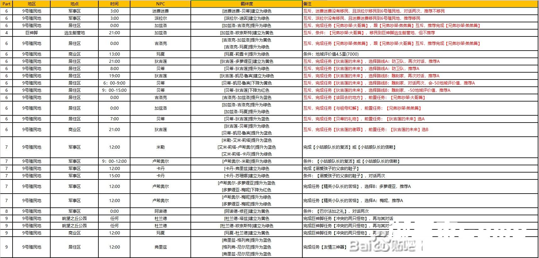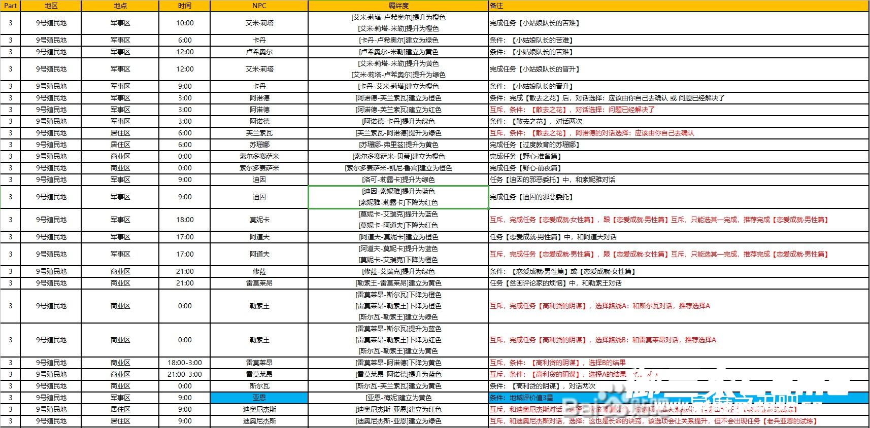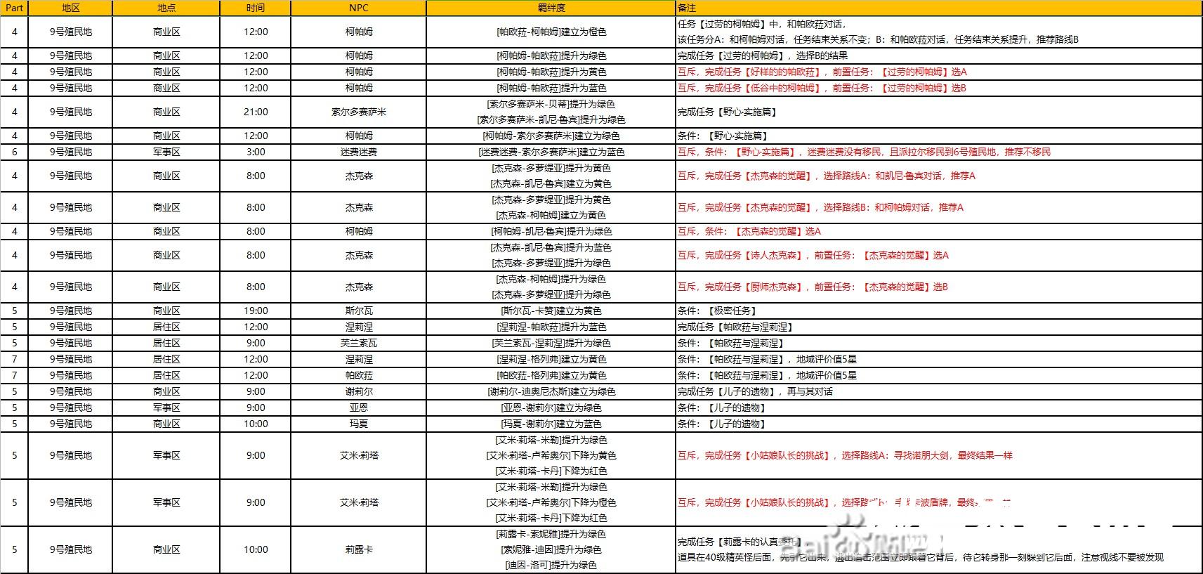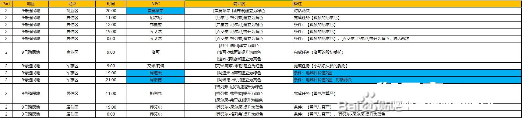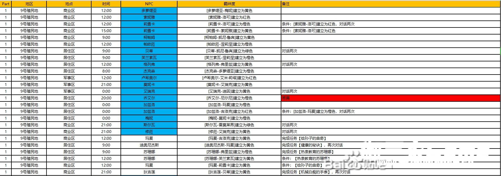 时间每3小时为一阶段,比如12:00,可以是12:00-15:00里面的时间。NPC蓝色背景表示初始可以建立(需两人登录羁绊图),红色名字表示这时候该NPC有任务,对话登录羁绊谱但不要接任务,建立关系再接取。