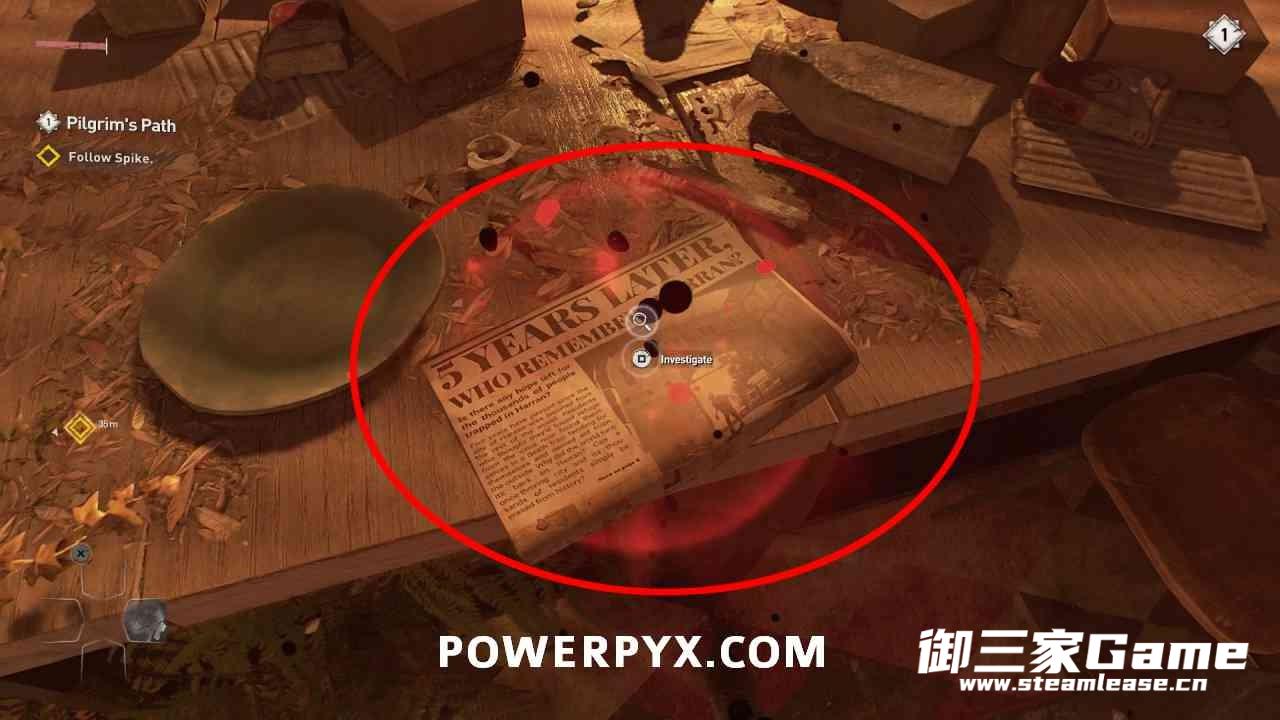 制作出第一个治疗道具后,跟随史派克进入庭院,进入房子后,穿过车库和走廊,来到厨房,左转,按下R3进行扫描,可以看到桌子上有一张报纸,按下互动键即可。