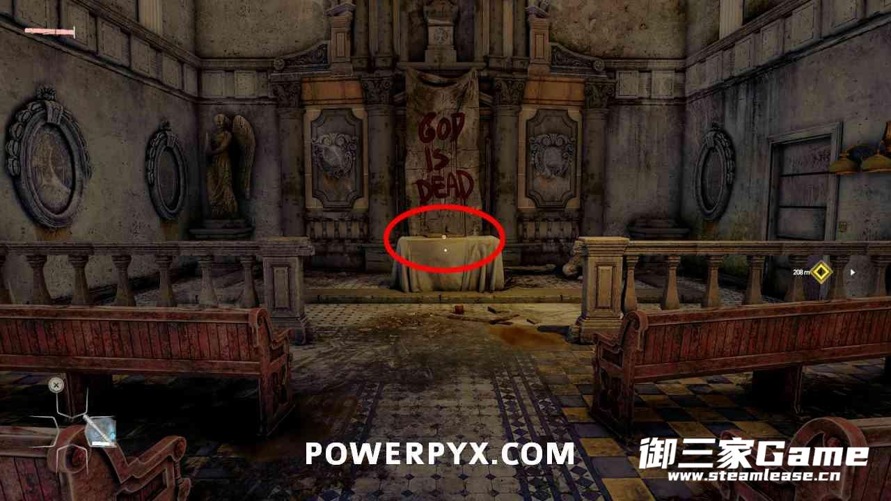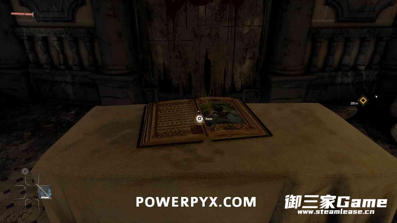 击败第一个小BOSS并度过第一晚后,时间来到早上,从睡觉的地方出来后沿着滑索滑下去,进入左边的教堂找到一本书。