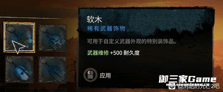 这个饰品装上之后武器加500耐久,没耐久了可以拆下来再装,相当于无限耐久了。