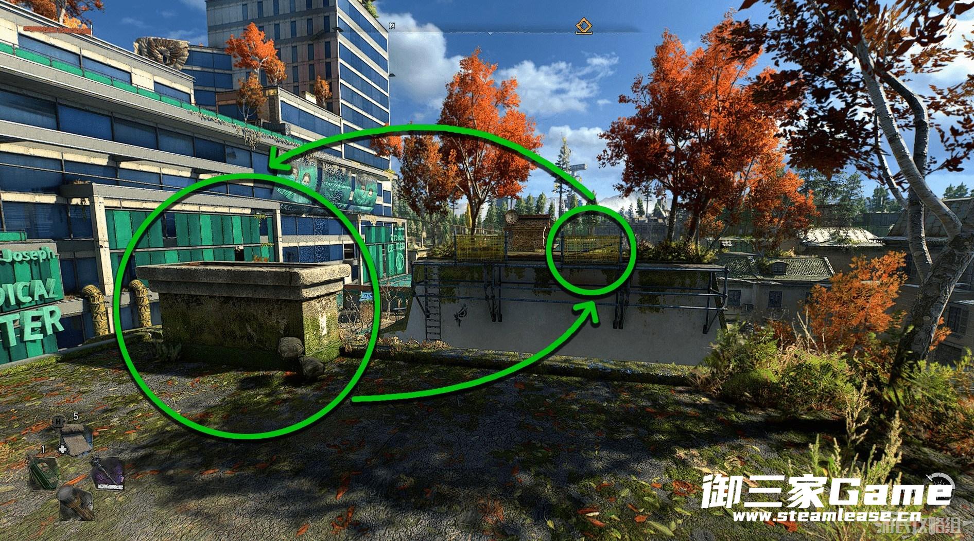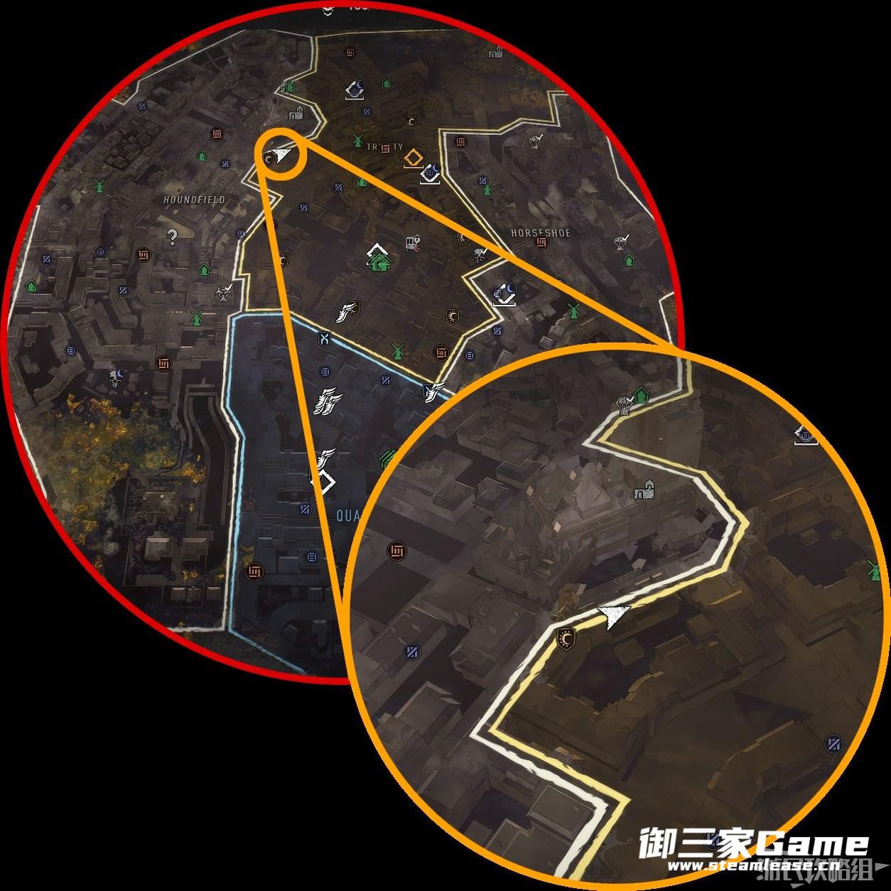来到旧维勒多,赫德菲尔德和三一的交界处,位置如下图。在这两个屋顶之间来回跳就可以了。