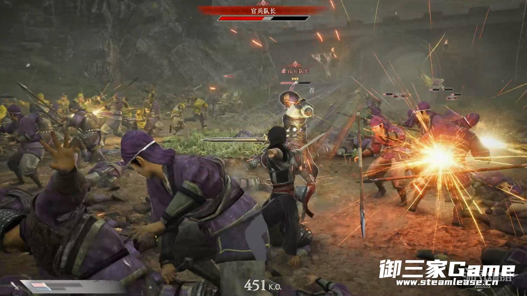 将城墙前方的士兵干掉后,会有一个BOSS血条的官兵队长从城门里出现,将他干掉完成序章的战斗,与关羽在篝火旁交谈,进入第一章。