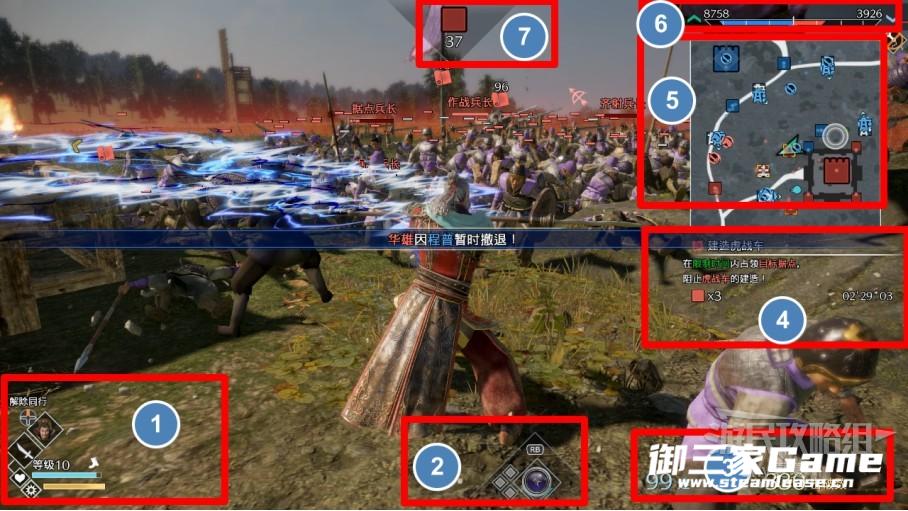 ①当前武将信息,从上到下分别为:同行武将、武将兵种、体力量表、无双量表;