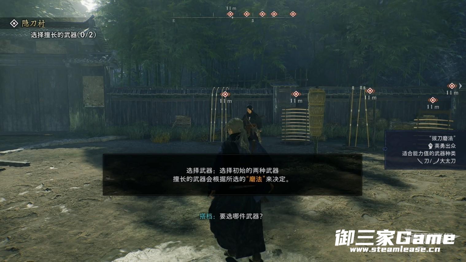 下面游戏正式开始,我们首先跟着隐刀贰来到训练场,这里可以选择两种武器携带在身上。