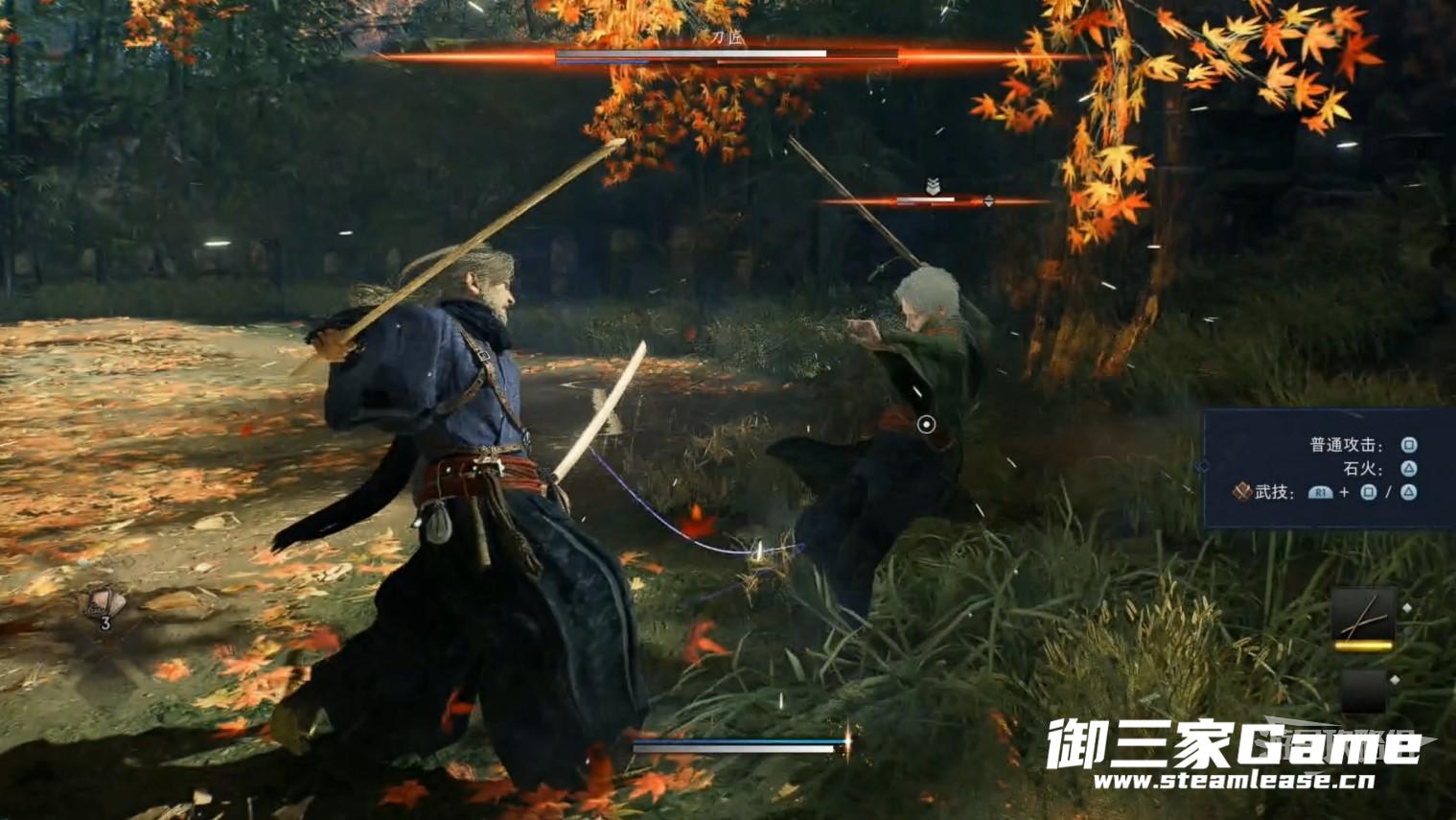 2、按下L1防御敌人的连续攻击,预判最后一下的时机,使用石火反击。