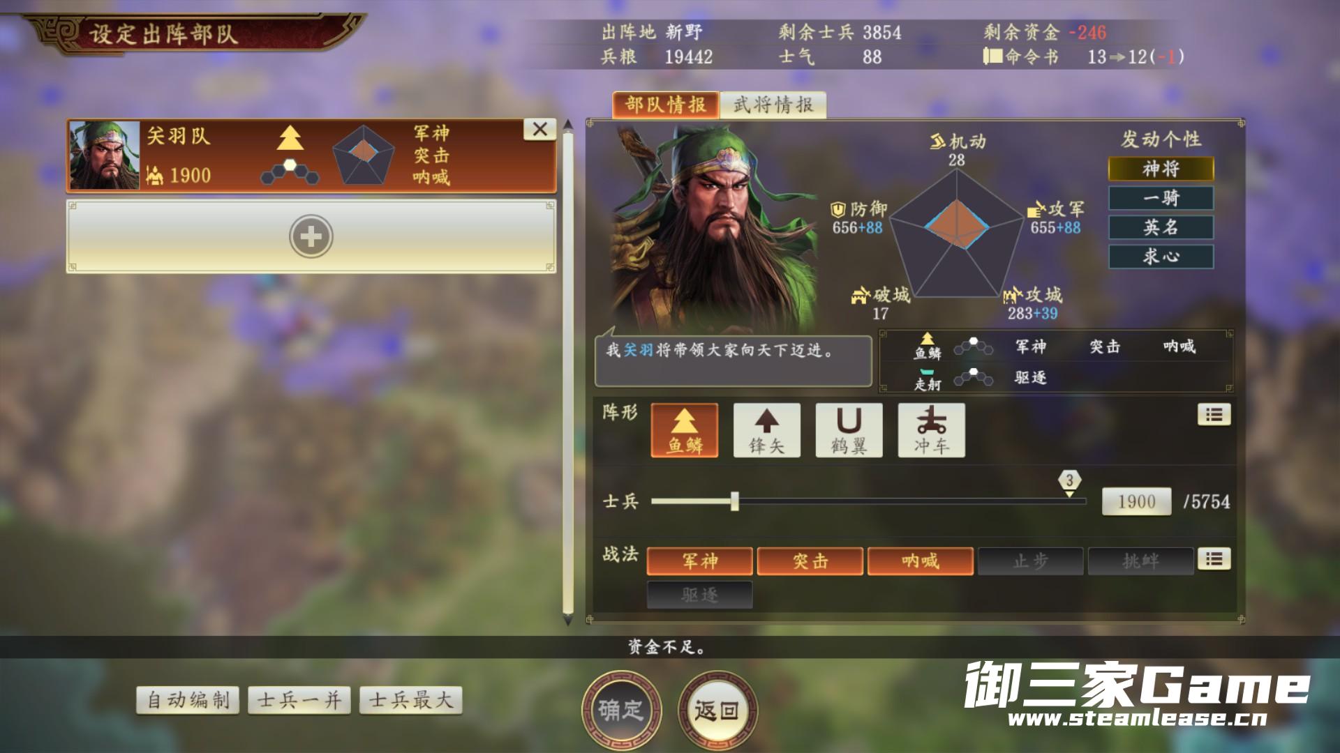 先上一张站位图,三爷守许昌林地,赵云方圆阵守汝南小道,关羽守宛城,不过这里关羽已经没钱出征了,探索不能停啊。