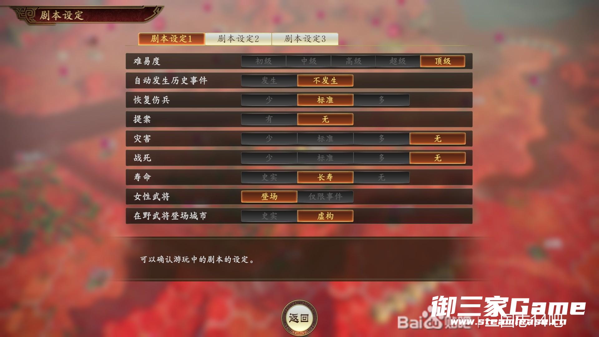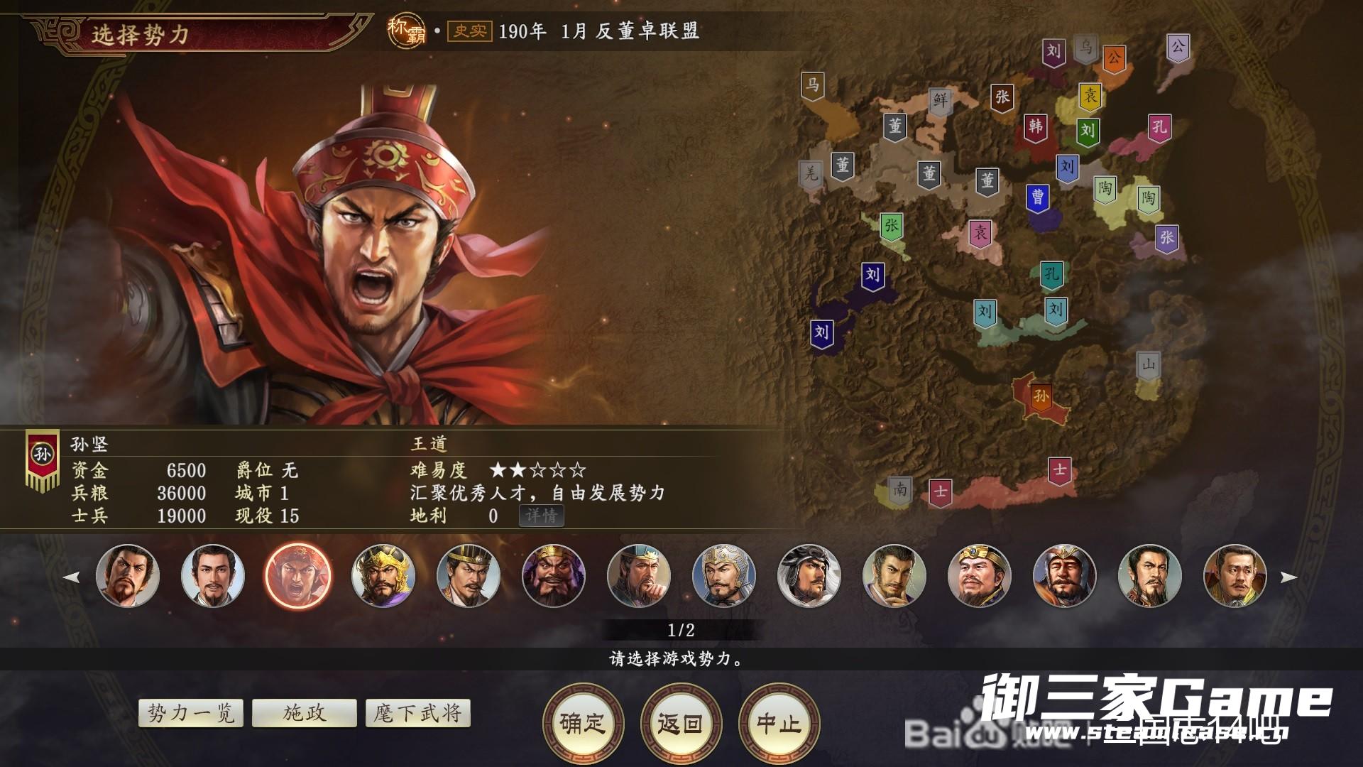 190年版本,孙坚,顶级,无灾害,无战死(太浪费时间) 长寿,其他标准,在野武将登场随机。